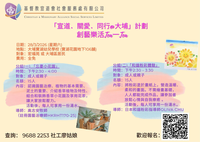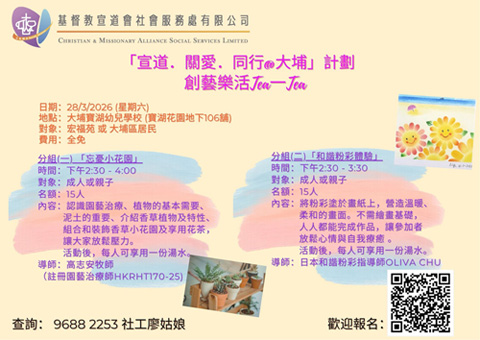 創藝樂活Tea-Tea,於28/3/2026在基督教宣道會寶湖幼兒學校舉行。
